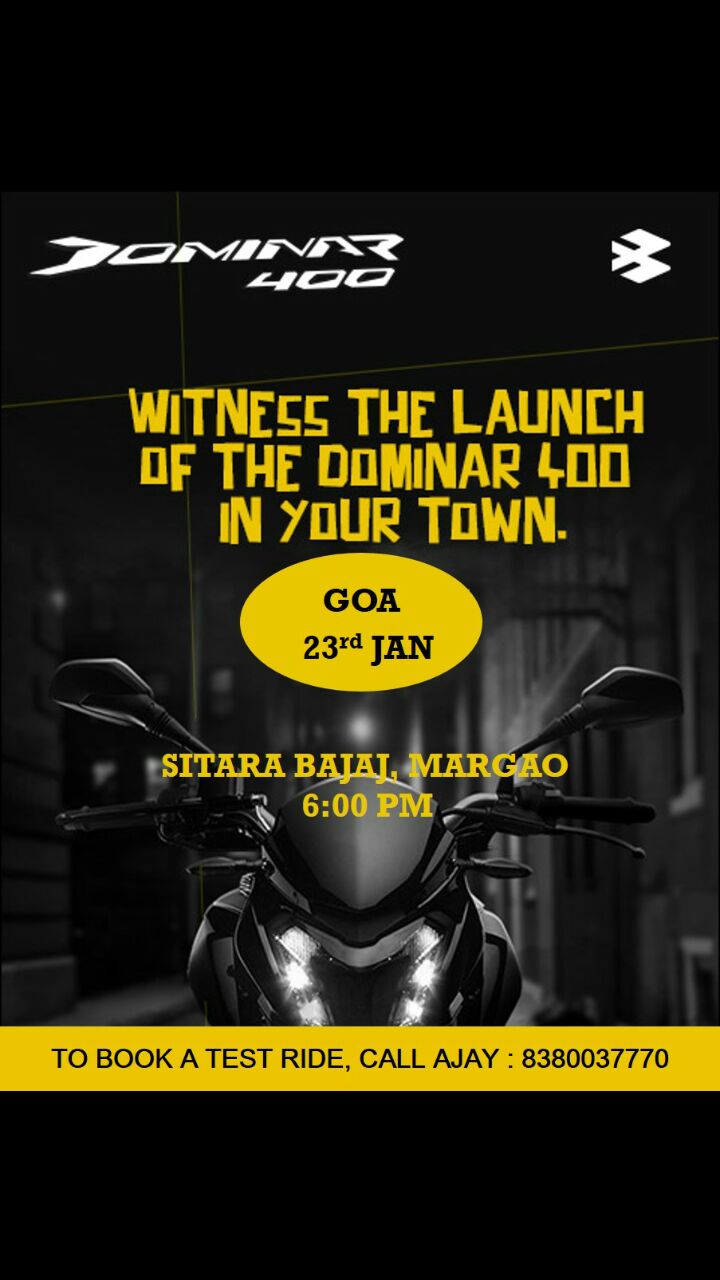 Dominar 400 Goa launch in Margao on 23rd, bookings to open soon.
