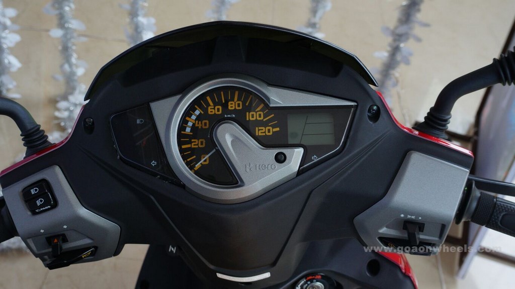 The Maestro Edge boasts of several new features like twin parking lamp, remote fuel lid, mobile charging port & boot light, integrated braking system, LED tail lamps, Immobilizer (anti-theft system) and digi-analogue dashboard.