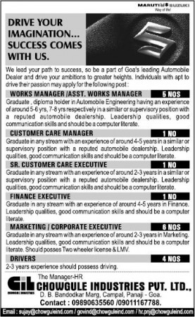 Chowgule Industries, Maruti Suzuki dealer in Goa are looking for Individuals who want a prominsing career in the auto industry.