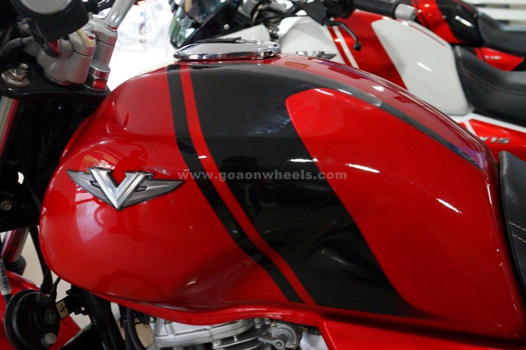 The Invincible character of the V motorcycle is supported by a large fuel tank which is made from the metal sourced from the erstwhile INS Vikrant battleship. The other distinguished feature is the double cradle frame which is designed to offer high rigidity and strength and enables the rider to ride erect with a proud stance.