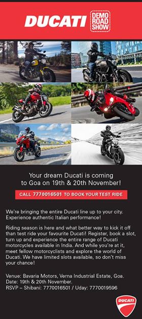 Ducati Pune are organizing a demo road show event in Goa where prospective customers can test ride all Ducati motorcycle available India.