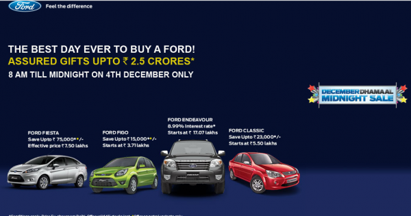 Besides offering a significant opportunity for savings and special interest rates on the Ford product range, the ‘Midnight-Sale’ will also provide customers with a chance to win assured gifts worth upto Rs 2.5 crore. Every customer who books a car during the ‘Midnight-Sale’ will receive a unique code coupon (given at the dealership after booking of the vehicle) and can win gifts such as LED TVs, Blackberry phones, digital cameras and DVD players.