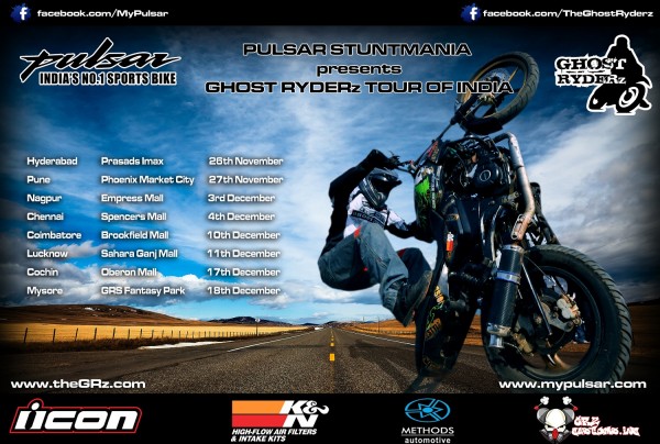 Ghost Ryderz in association with Pulsar Stunt Mania is going to travel to 8 cities across India and perform Freestyle Stunt Shows.