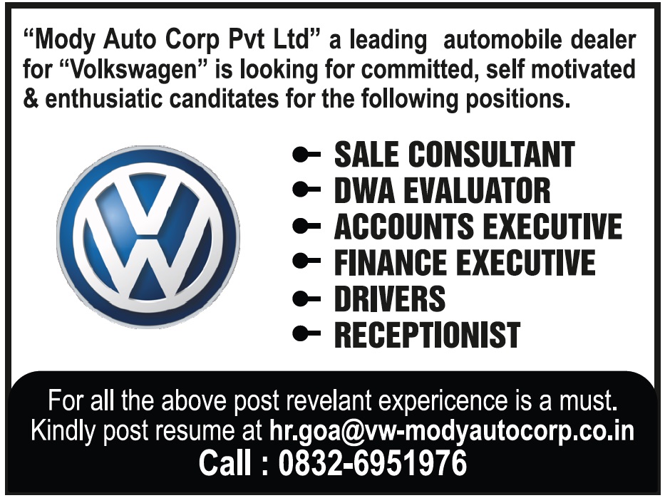 Volkswagen Goa, part of Mody Auto Corp is hiring for various positions for their dealership in Panjim.