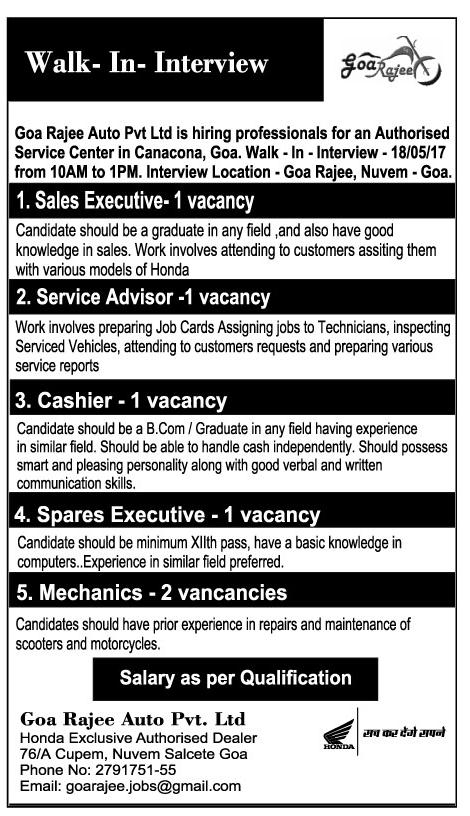 Goa Rajee dealer for Honda 2 Wheelers in Goa in hiring professionals for the authorised service centre in Canacona.