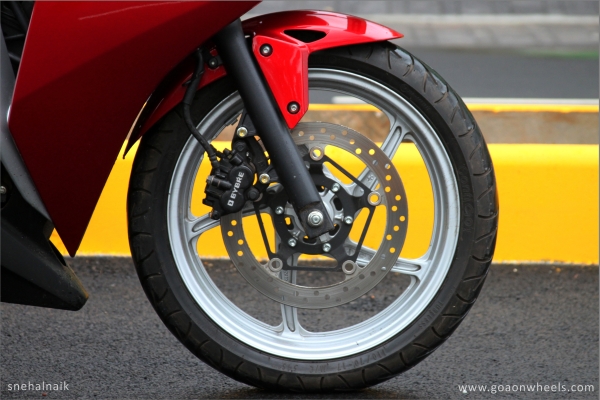 The bike gets tubeless 110/70-17 tyre at the front and 140/70-17 unit at the rear. The wide tyres will only help to increase the grip on roads especially on wet tarmac. The five spoke aluminium wheels add more appeal to the bike.