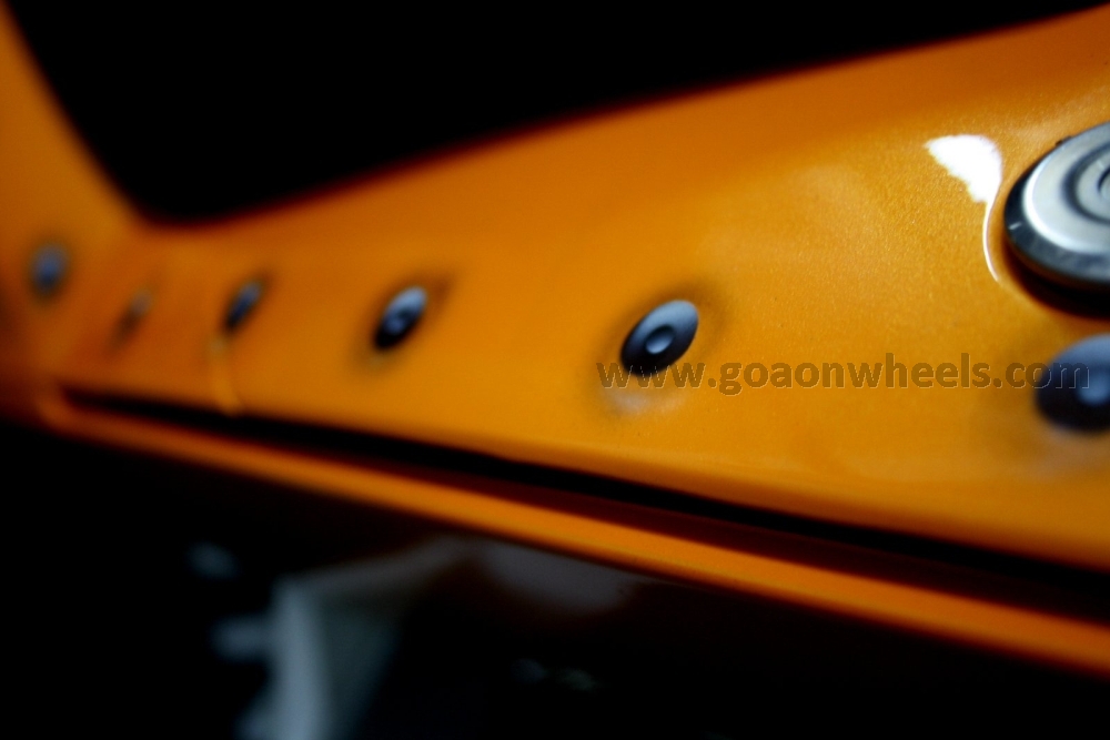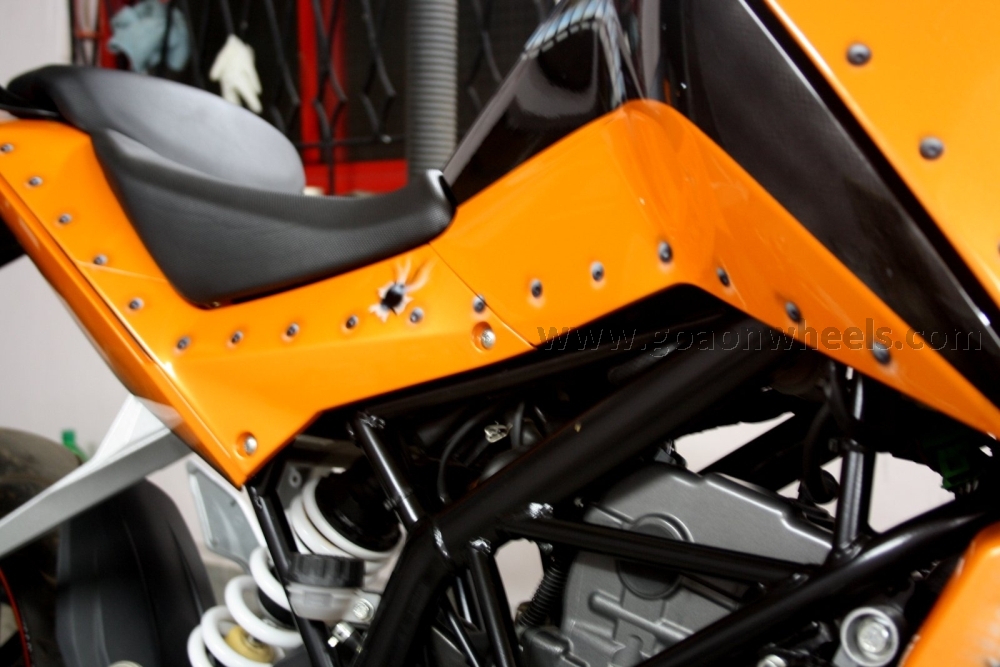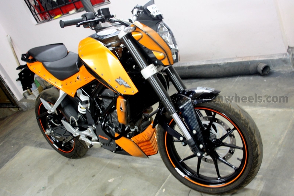 The modified Duke bears the same orange scheme but gets detailing like rivets all along the panels and a custom graphics on the fuel tank and front fender. The front headlight panel also gets a mesh alike detailing.